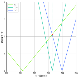 下图为8/7, 7/6和3/2的误差与8/7的调音的关系,其中横坐标为8/7的调音(音分值),纵坐标为误差(音分值),橙色点为最小化这三者最大误差的调音,也就是1/4音差调音(8/7的调音为(8/7) * (1029/1024)^(1/4), n3/2的调音为(3/2) / (1029/1024)^(1/4), 7/6是准确的),生程大小约为233.282¢.